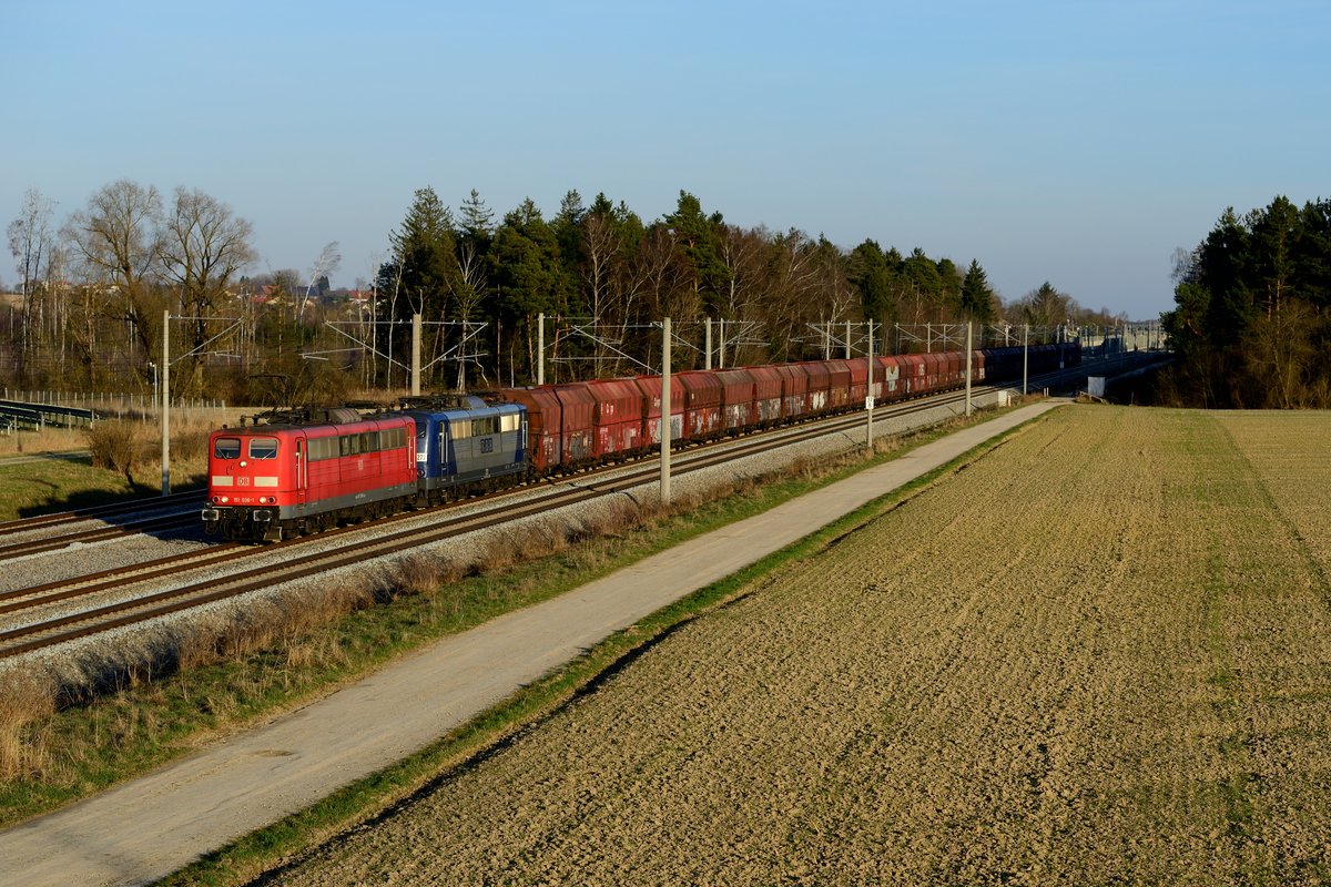 Im warmen Abendlicht kam am 25. März 2017 der GM 60270 von München Johanneskirchen nach Oberhausen West in Hörbach vorbeigefahren. Gezogen wurde der Leerkohlezug von der 151 036, die zusätzlich noch die kalt mitlaufende RBH 272 im Schlepp hatte.