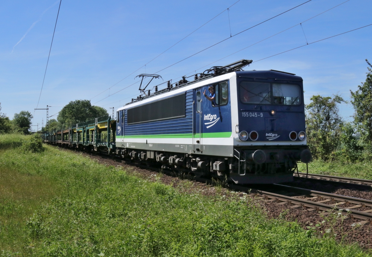 IntEgro 155 045-9 (NVR: 91 80 6155 238-9 D-PRESS) am 01.06.2017 mit unbeladenen Autotransportwagen bei Ahlten (HALT) Ri Osten unterwegs...<br>