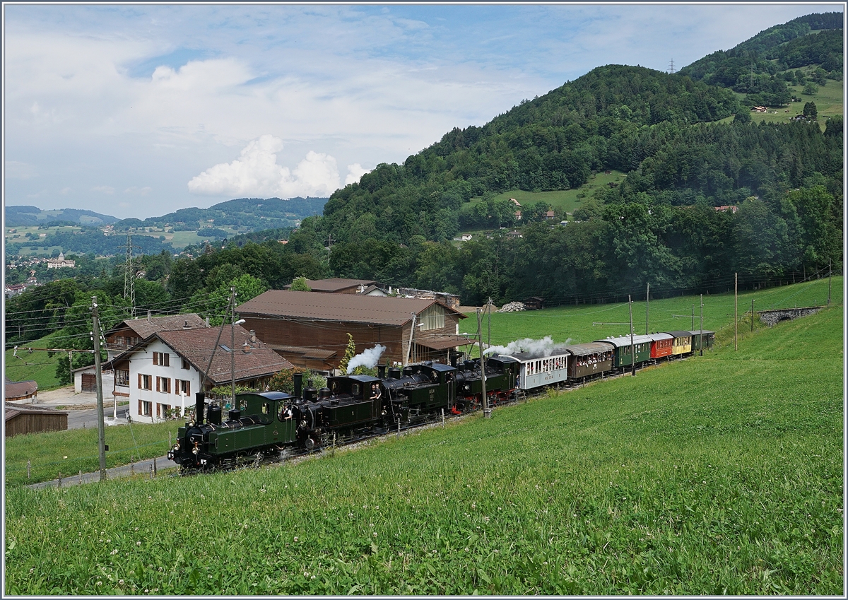 Vier kleine Dampfloks ziehen kurz vor Chaulin einen gut besetzten Museumszug Richtung Chamby - die Vierfachtraktion ist schon fast zum Markenzeichen des eibte Pfingstdampffestival der B-C geworden.
