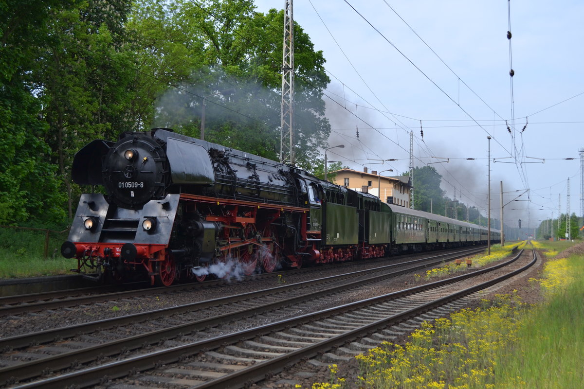 Die 112 116 mit dem umgeleiteten RE 3314 von Berlin Hbf (tief) nach Stralsund Hbf bei der Durchtahrt am18.05.2017 in Berlin-Hohenschönhausen.