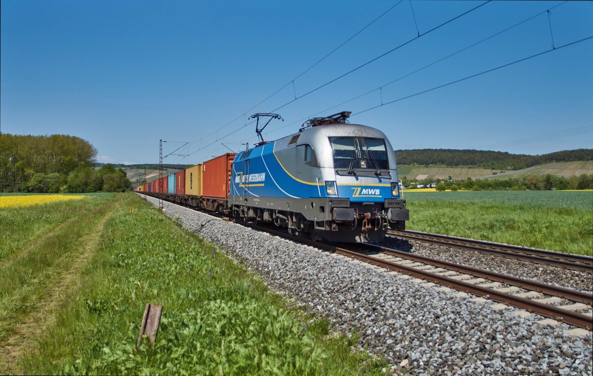182 911-8 von der MWB-Bahn ist am 10.05.2017 mit einen Containerzug in Richtung Süden bei Retzbach-Zellingen unterwegs.