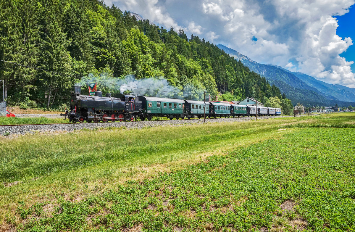 Frisch aus der HW Linz entlassen wurde wohl die 1116.176 - glänzend wie ein "Speckschwartl" und mit neuem Stromabnehmer versehen. Am 01. April 2017 konnte ich diese Maschine vor einem gemischten Güterzug in Wernstein aufnehmen.