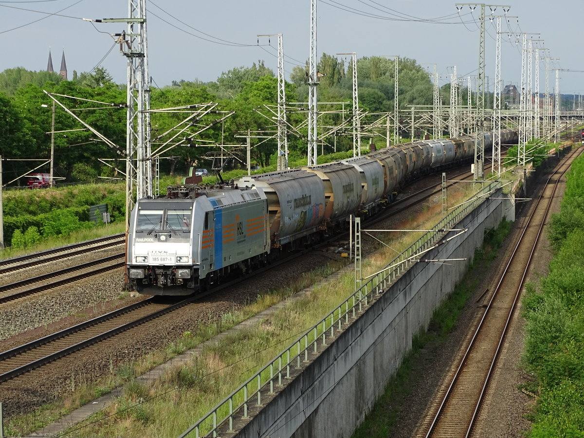 Am 05.06.2017 kam die 185 687 mit einem Tranczeraleszug aus Richtung Magdeburg nach Stendal und fuhr weiter in Richtung Uelzen.