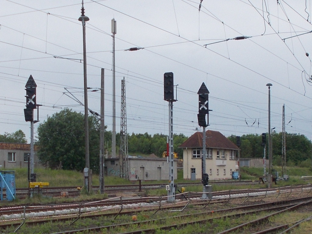 Auch an der westlichen Ausfahrt von Bergen/Rügen stehen schon die künftigen,neuen Ausfahrsignale schon.Aufnahme vom 03.Juni 2017.