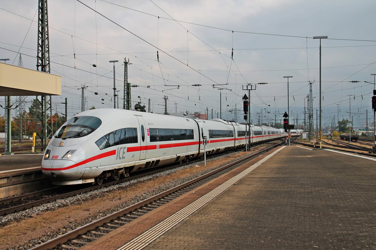 Einfahrt am 13.10.2015 von 406 507-4 (4607)  Hannover  als ICE 504 (Basel SBB - Köln Hbf) zusammen mit NS 406 052-1 (4652)  Arnhem  als ICE 104 (Basel SBB - Amsterdam CS) in Basel Bad Bf auf Gleis 4.