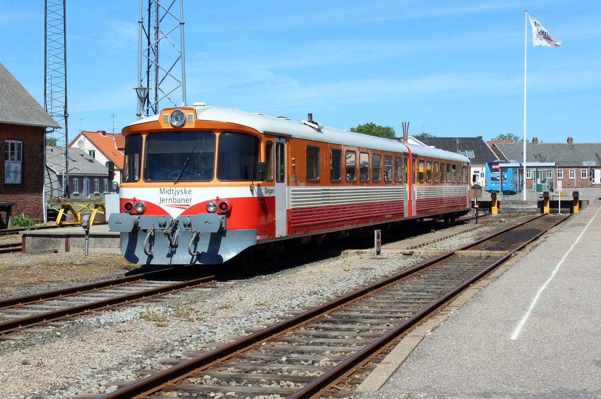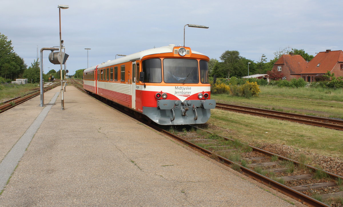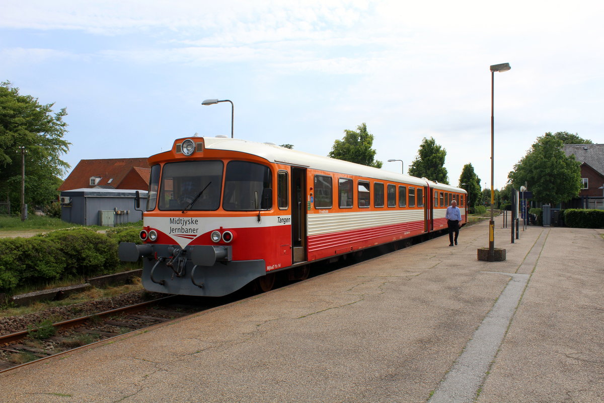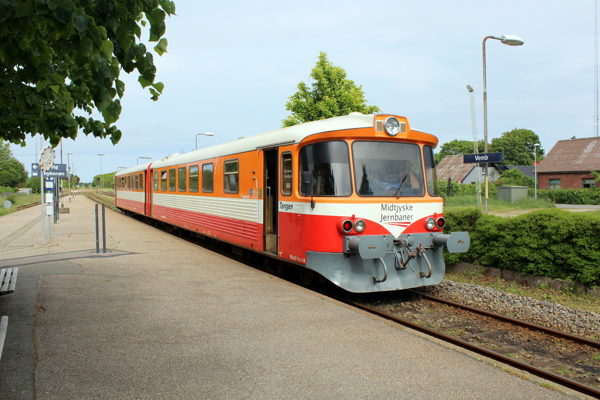 Midtjyske Jernbaner - Lemvigbanen (Vemb - Lemvig - Thyborøn): Am Nachmittag des 2. Juni 2017 steht der Triebzug  Tangen  (:  die Landenge ) im Bahnhof Vemb abfahrbereit. - Der Dieseltriebzug besteht aus dem Triebwagen MjbaD Ym 14 (im Vordergrund) und dem Steuerwagen MjbaD Ys 14 (DUEWAG 1983). - Auf der Lemvigbanen fahren die letzten sich in Betrieb befindlichen Triebzüge dieses Typs, der früher auf vielen dänischen Privatbahnen üblich war. - Die Bahn fährt durch eine dünn besiedelte, aber landschaftsmässig höchst interessante Gegend im nordwestlichen Jütland (das zeigen meine Bilder leider nicht, aber Date Jan de Vries hat früher einige sehr schöne sehenswerte Aufnahmen von den Zügen der Bahn auf bahnbilder.de hochgeladen). Wenn man als Fahrgast im Zug unterwegs ist, sieht man deutlich, wie sich die Landschaft verändert; sie wird immer rauer und die Bewachsung weniger üppig. - Außer der Bahn ist die kleine Hafenstadt Lemvig sehr empfehlenswert.