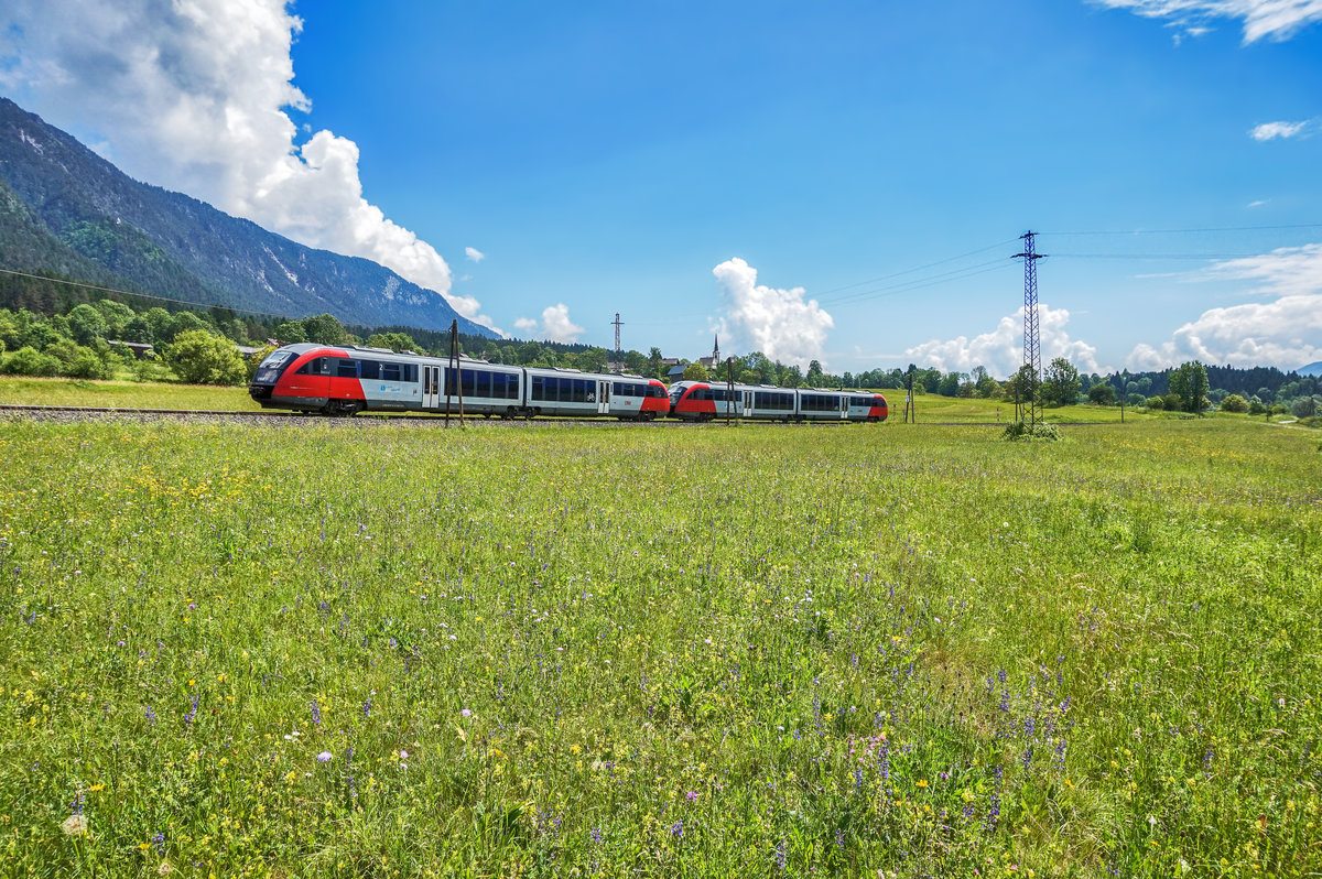 Am 1. Juni 2017 schlängelten sich die Triebzüge 612 575 und 612 586 in Doppeltraktion aus dem Bahnhof Memmingen in Richtung Kempten.