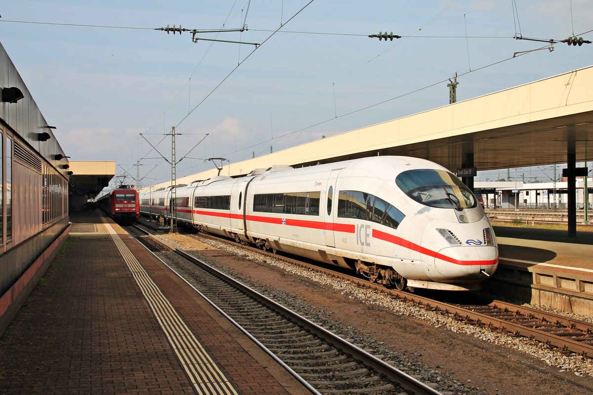 Nachschuss auf NS 406 052-1 (4652) "Arnhem", der am 13.10.2015 als ICE 104 (Basel SBB - Amsterdam CS) zusammen mit 406 507-4 (4607) "Hannover" als ICE 504 (Basel SBB - Köln Hbf) auf Gleis 4 in den Badischen Bahnhof von Basel fuhr.