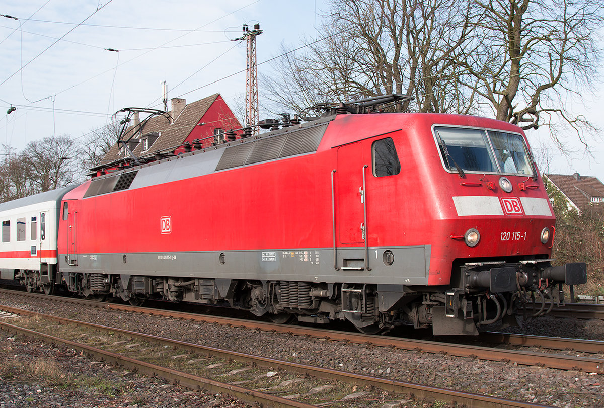 Aufgrund der Bauarbeiten auf der Hauptstrecke werden einige Fern- und Regionalzüge über die Güterstrecke umgeleitet. 120 115 auf dem Weg von Hamburg nach Düsseldorf HBF durchfährt gerade den ehemaligen Bahnhof Ratingen Lintorf.