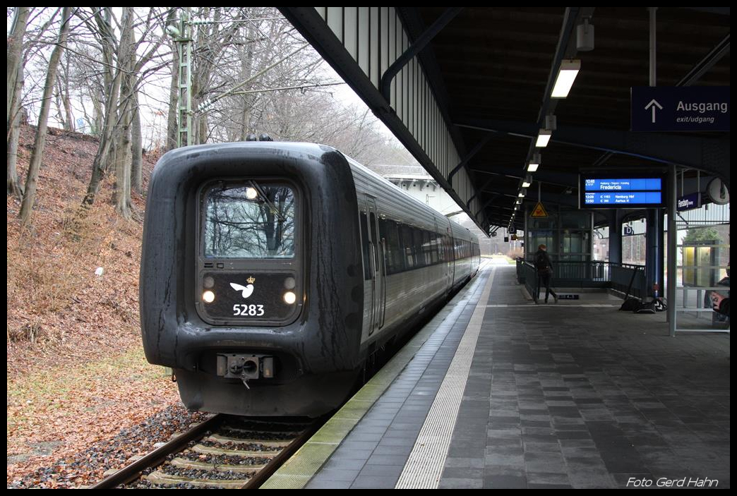 DSB Dieseltriebwagen 5283 nach Fredericia steht als IC am 5.3.2017 um 10.35 Uhr abfahrbereit im Bahnhof Flensburg.