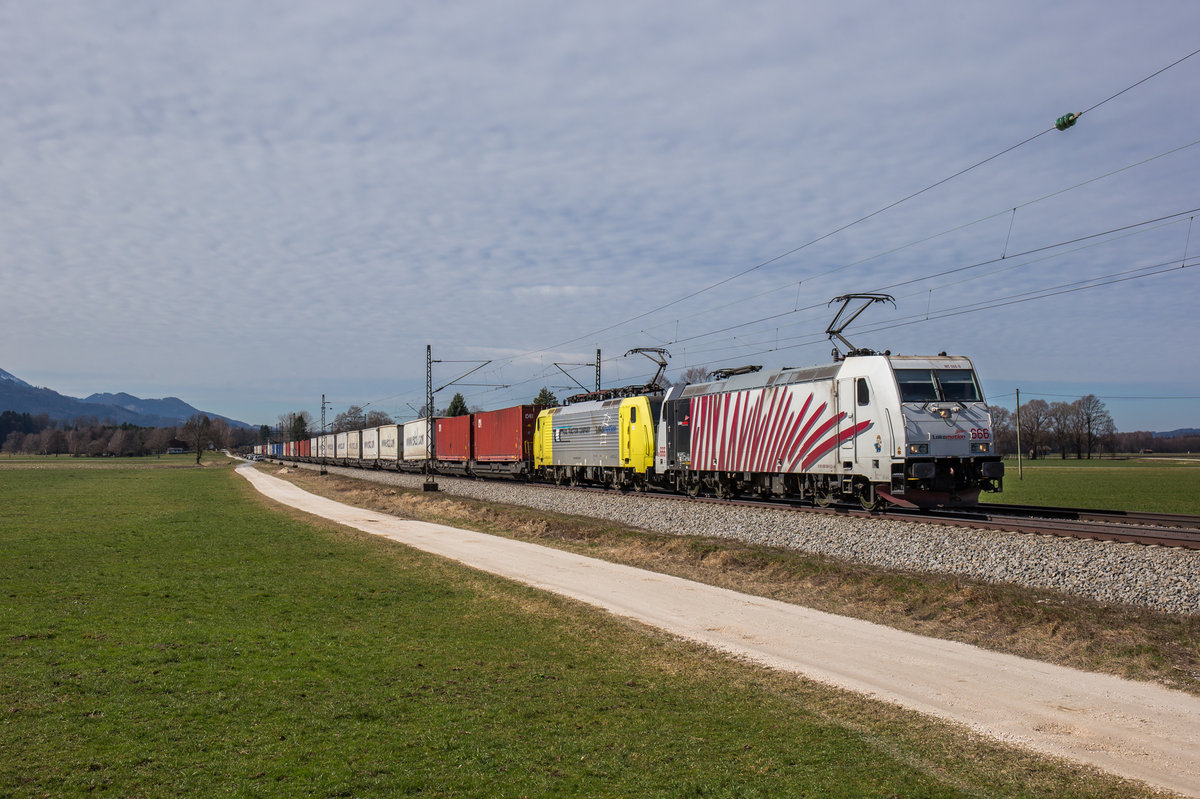Nachdem der Bauer bei Fellach recht erbost auf meine Frage reagiert hatte, ob ich von seiner Wiese aus fotografieren dürfe - Hobby-"Kollegen" hatten sich die Tage zuvor wohl unmöglich aufgeführt und ihren Müll hinterlassen - musste ein alternativer Standort gefunden werden. Dieser wurde einige 100 Meter weiter östlich im Wald gefunden. Nach einiger Wartezeit kam dann mit dem von 189 914 bespannten DGS 41856 auch noch eine attraktive Leistung vorbei (06. Mai 2016).