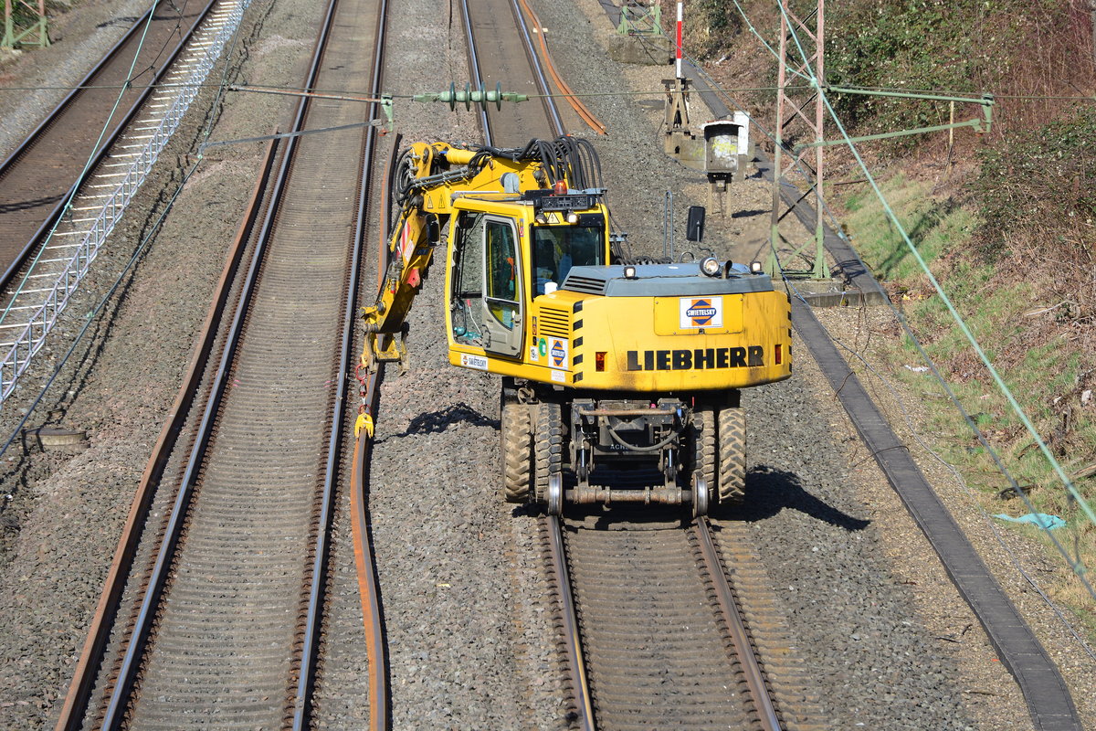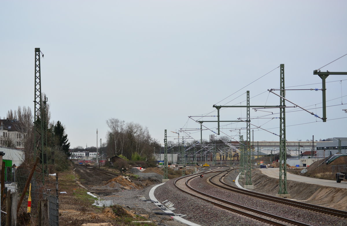 Am 10.3.17 war von der Großbaustelle zwischen Düsseldorf und Düsseldorf Flughafen noch nicht viel zu sehen. Die feste Absperrung wurde schon aufgebaut und die Neuschienen wurden bereits verlegt.