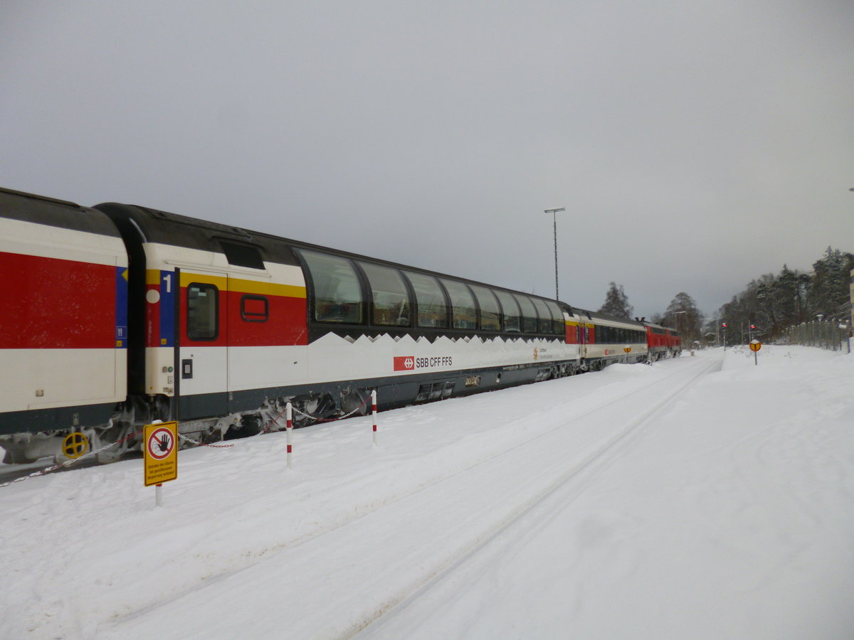 Da der Block noch durch einen Regionalzug belegt war, musste der Zug stark einbremsen, was man gut an den Wagen erkennt.