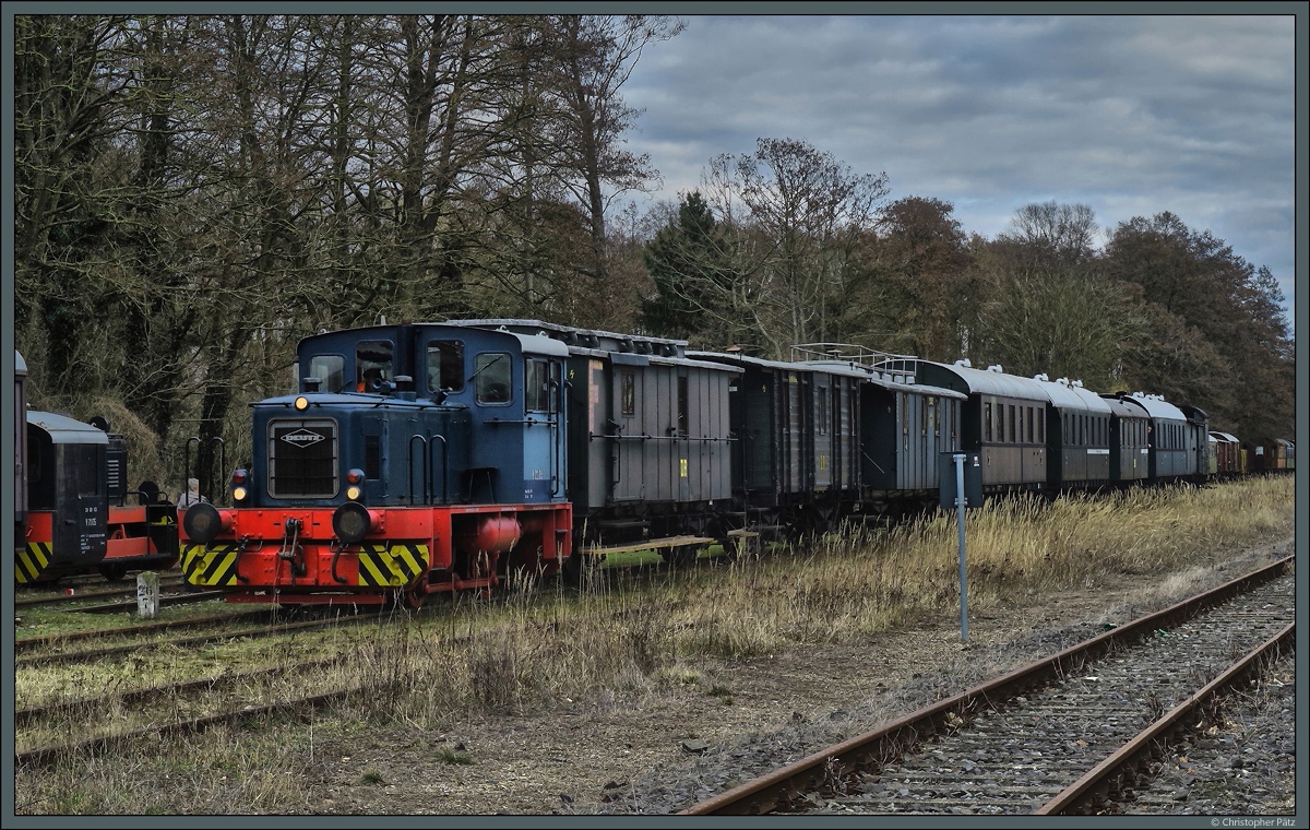 Zu den im Bahnhof Loburg vom Verein Dampfzug-Betriebs-Gemeinschaft betreuten Maschinen gehört auch die V 21.03, eine ehemalige Werklok der Hafenbahn Haldensleben. (Loburg, 05.03.2017)