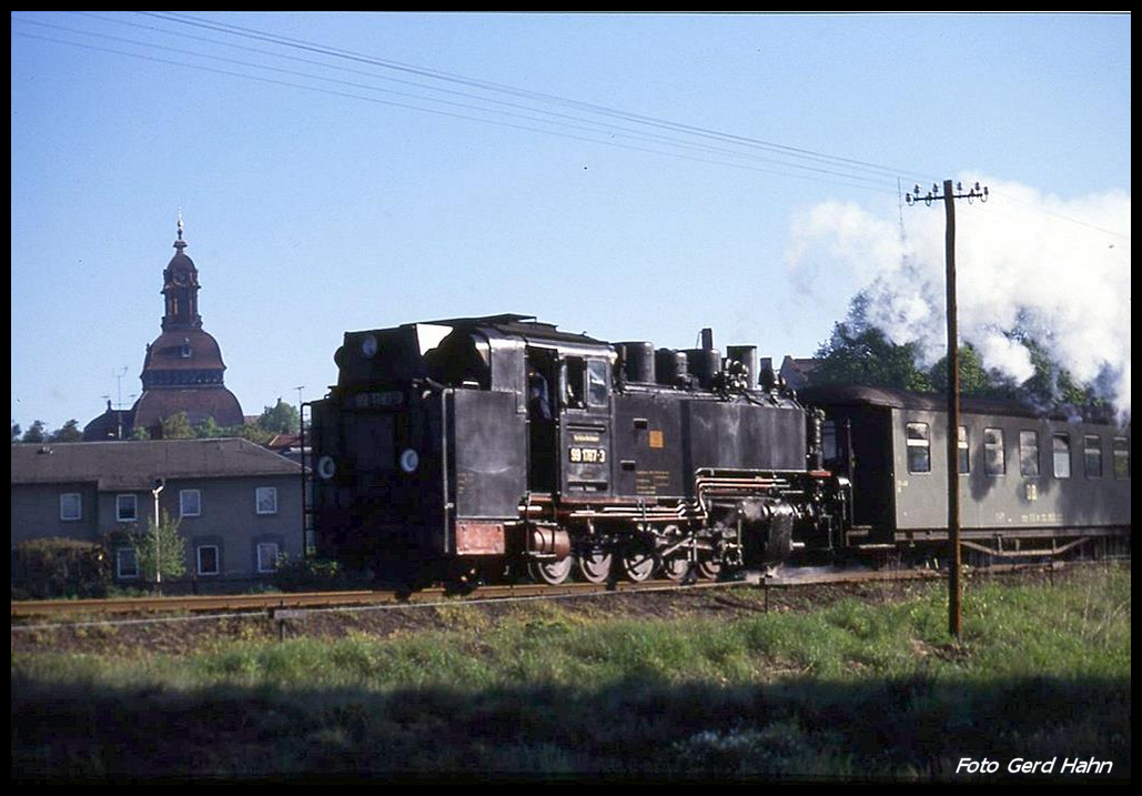 991787 fährt mit dem P 14286 am 4.5.1990 in Moritzburg in Richtung Radebeul ab.