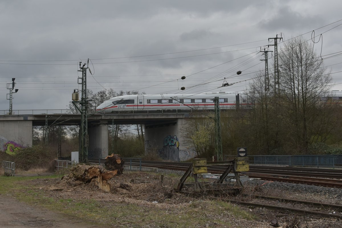 Nach dem Freischnitt ist der Prellbock des Schutzgleises zu sehen. Im Hintergrund fährt der ICE Valero D 714 in Richtung Mannheim durch. Groß-Gerau den 19.3.2017