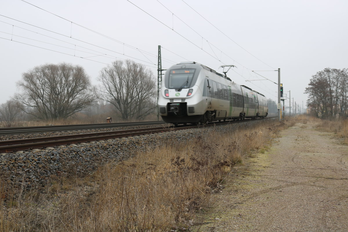 S3 der S-Bahn Mitteldeutschland nach Borna mit 1442 503 zwischen Haltepunkt Halle-Messe und Dieskau. [7.2.2017]