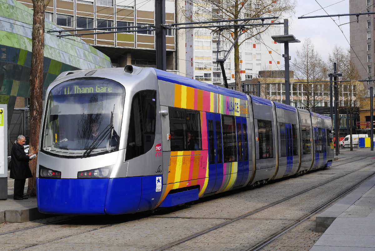 Wagen 07 der Straßenbahn Mülhausen/Elsass auf dem Pont Wilson vor der Endstelle am Hauptbahnhof, 22. März 2017.
