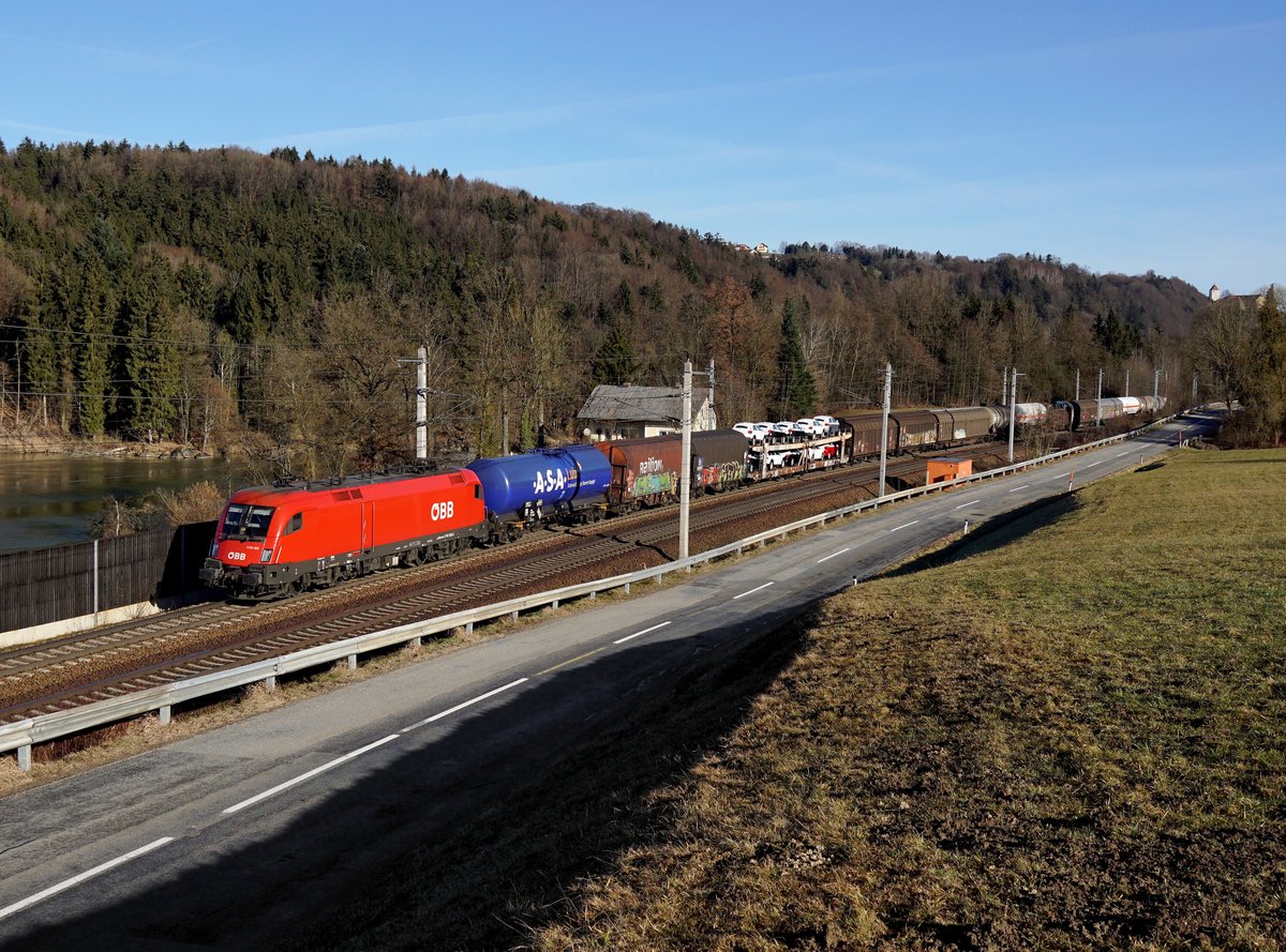 Die 1116 150 mit einem Güterzug am 04.03.2017 unterwegs bei Wernstein.