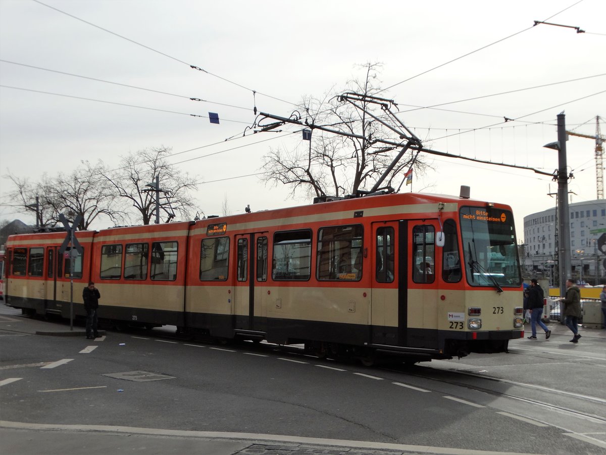 MVG Düwag M8C Wagen 273 hat wieder seinen Ursprungslack bekommen und fährt wieder durch Mainz. Hier am 04.03.17 am Hauptbahnhof vom Bussteig aus fotografiert