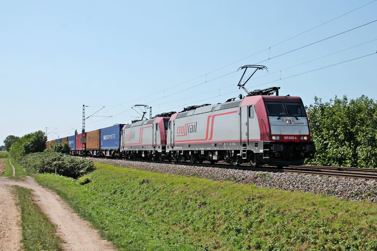 Am 31.08.2015 bespannte Beacon Rail/Crossrail 185 600-4 zusammen mit Beacon Rail/Crossrail 185 601-2 einen Containerzug (Italien - Antwerpen) bis nach Aachen West, als sie bei Hügelheim in Richtung Freiburg fuhren.