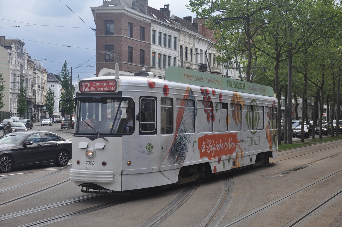 De Lijn Antwerpen PCC7008 auf Linie 12 Richtung Sportpaleis, aufgenommen 13.05.2017 am Haltestelle Bresstraat, noch bis Anfang Juni fahren die alte PCC auf diese Strecke