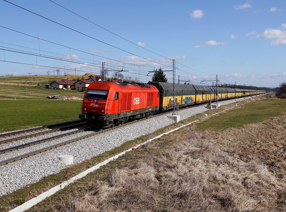Die 2016 084 mit einem Autozug am 11.03.2017 unterwegs bei Črešnjevec.