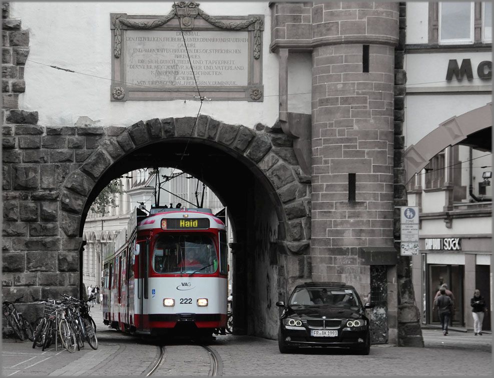 GT8 222 im Einsatz auf der Linie 3, in der Innenstadt bei der Durchfahrt des Martinstors. 13.5.17.