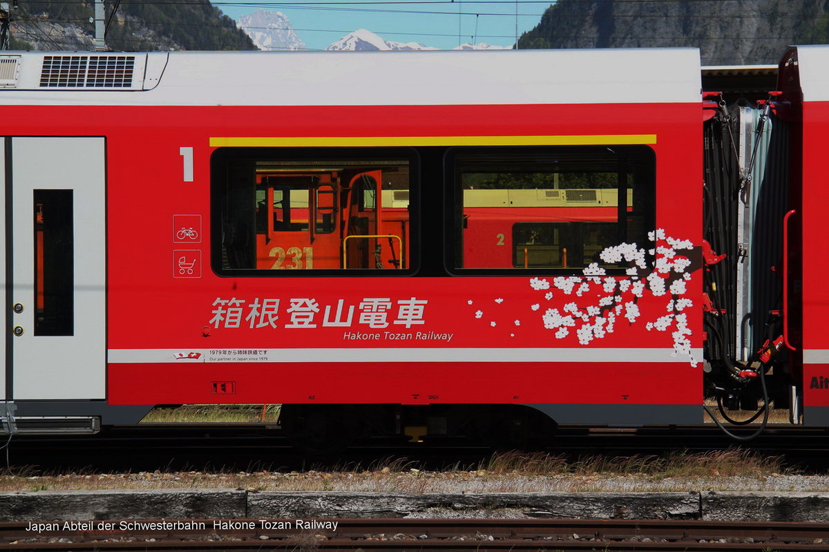 spezielles "Japan Abteil" der Schwesterbahn im ALVRA Gliederzug.Landquart 16.05.17