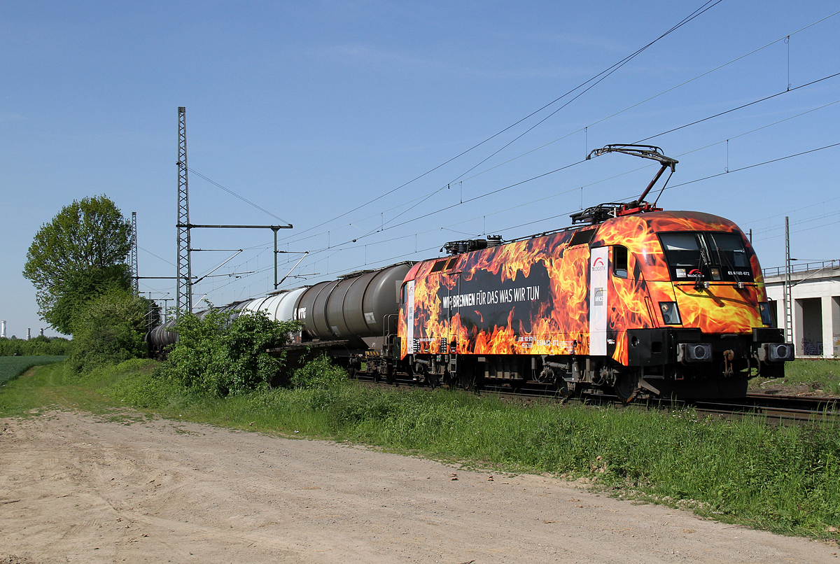 185 034 mit einem Mischer auf linksrheinischer Seite talwärts fahrend auf der Kbs 470 am 14.5.2017