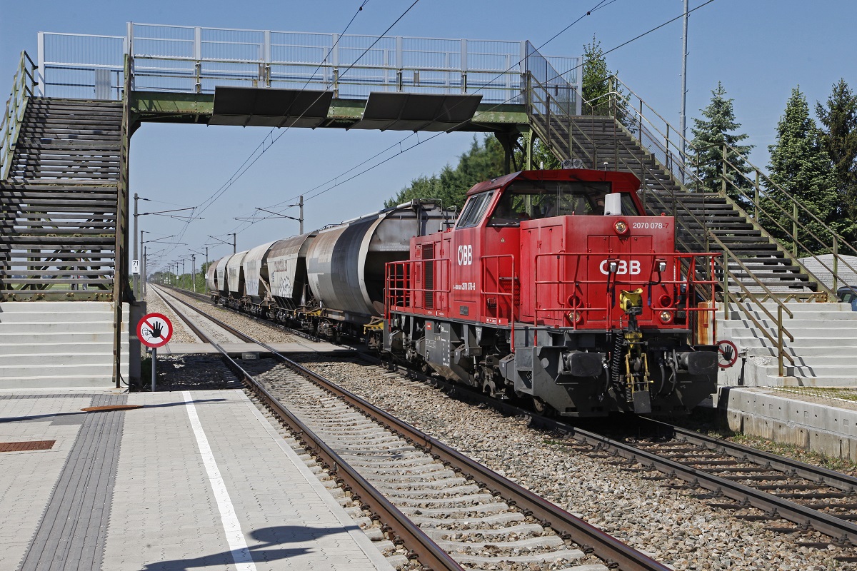 2070 078 mit Verschubgüterzug in der Haltestelle Rabensburg am 18.05.2017.