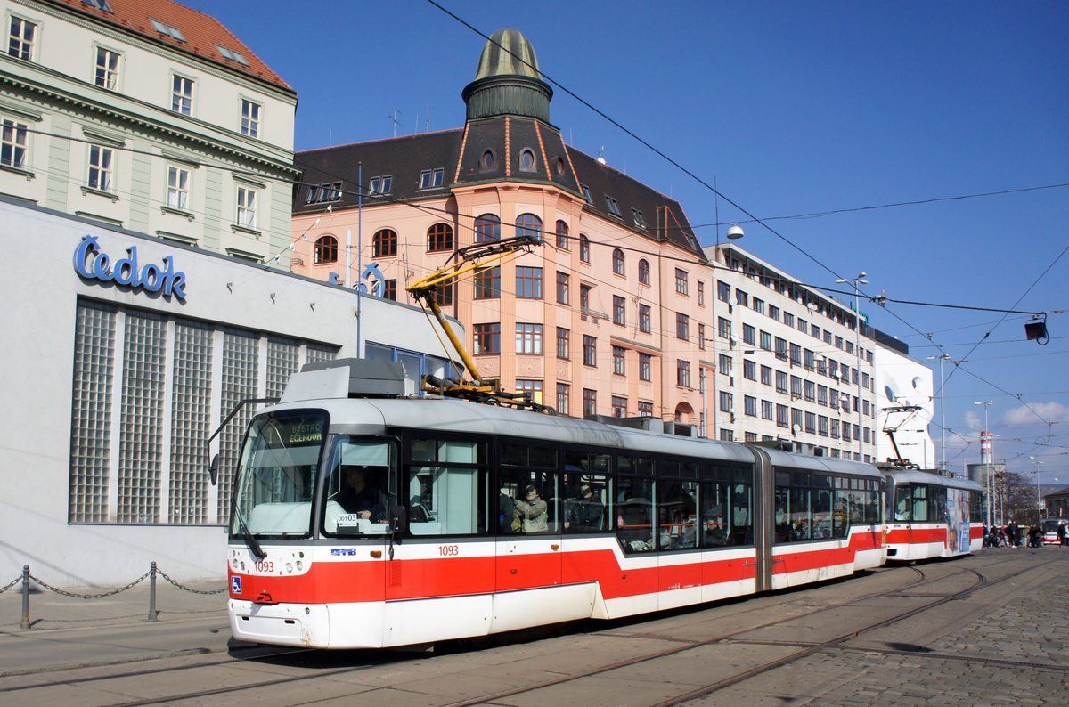 Tschechien / Straßenbahn (Tram) Brno / Brünn: Vario LF2R.E - Wagen 1093 sowie Vario LFR.E - Wagen 1573 von Dopravní podnik města Brna a.s. (DPMB), aufgenommen im März 2017 am Hauptbahnhof der tschechischen Stadt Brünn.