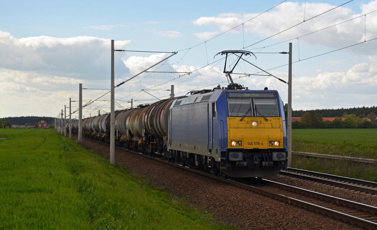 146 519 schleppte am 29.04.17 einen Kesselwagenzug im Auftrag der HSL durch Rodleben Richtung Roßlau.
