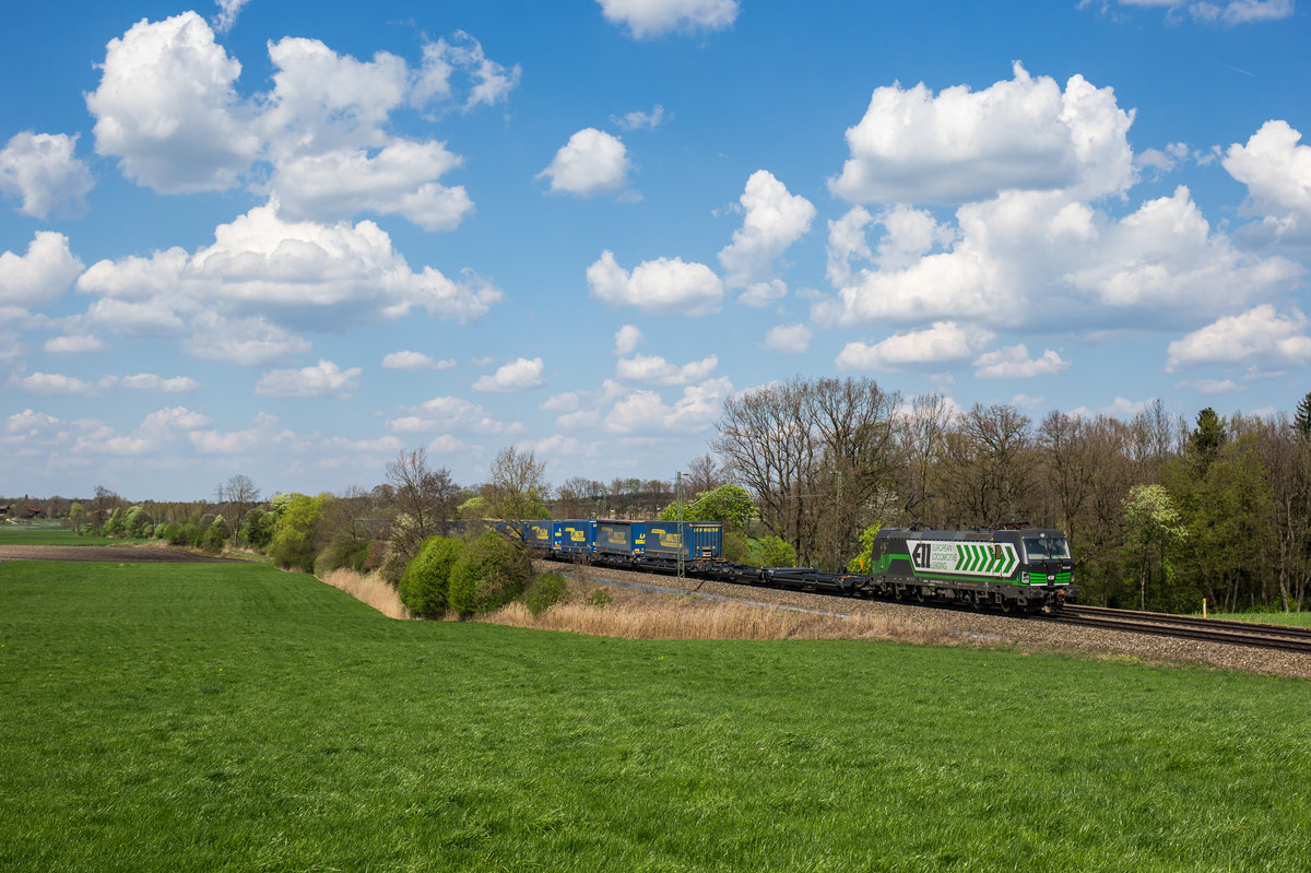 193 208, damals noch im Einsatz für Lokomotion, fuhr mit dem Walter-KLV bei Hilperting in Richtung Kufstein, aufgenommen am 10. April 2017.