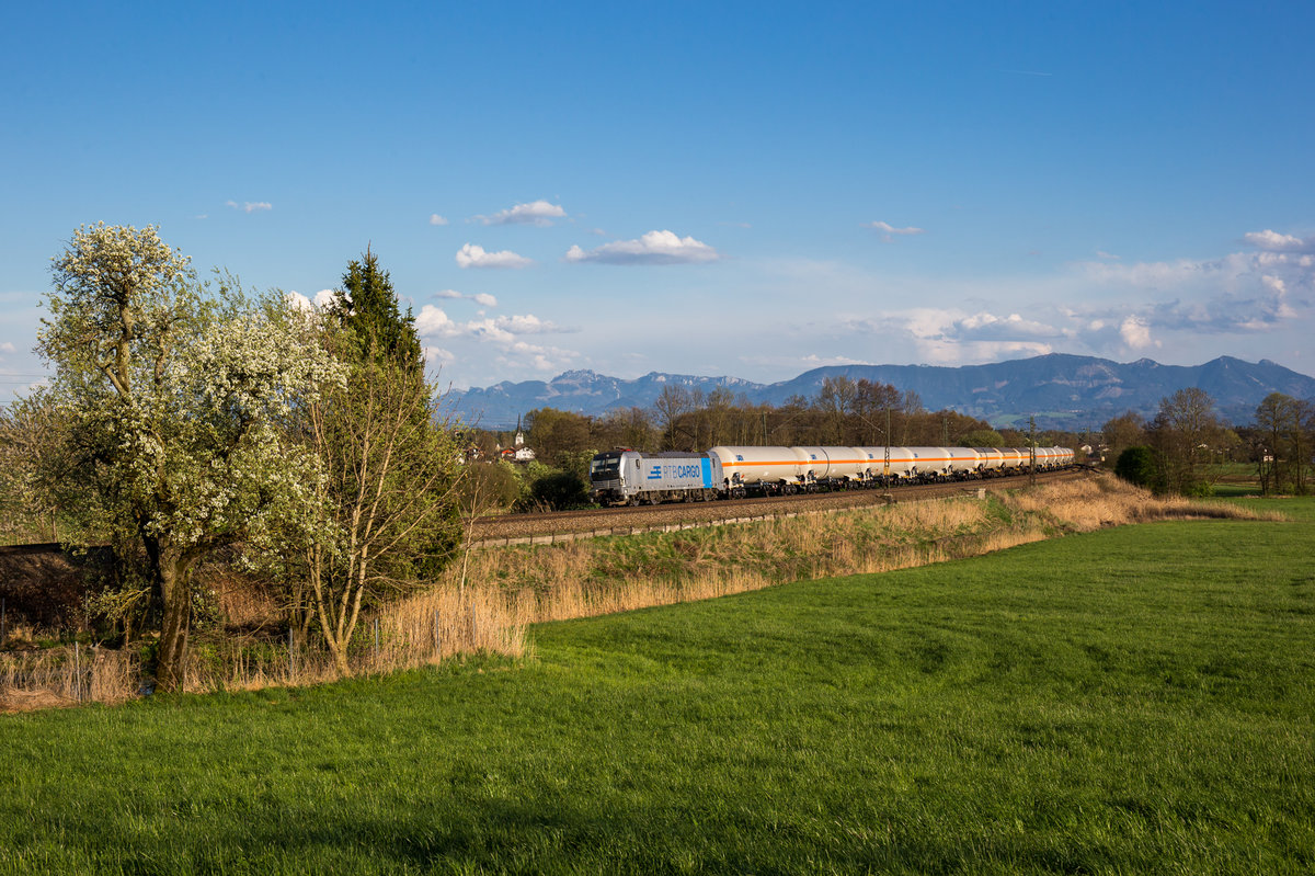 193 816 der RTB war am 10. April 2017 mit einem umgeleiteten Kesselzug bei Rann in Richtung München unterwegs.