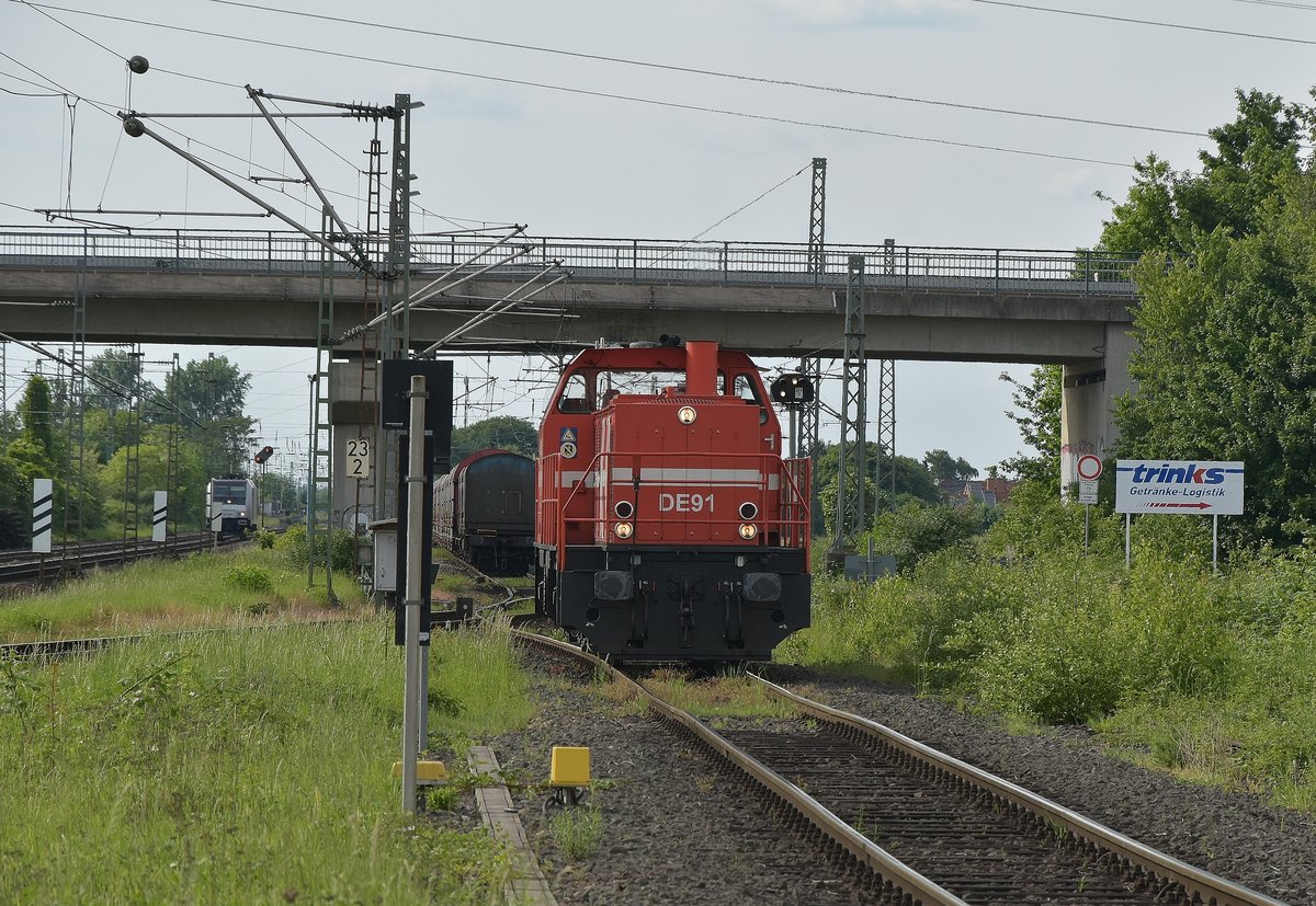 Im Hintergrund umfährt die 185 696 den Übergabebahnhof und wird ins Abstellgleis einrücken. Während im Vordergrund die DE91 nun an den soeben eingetroffen Nievenheimer heran fährt und ihn neu sortiert, bevor sie ihn ins Aluminiumwerk bringt am Sonntag den 21.5.2017