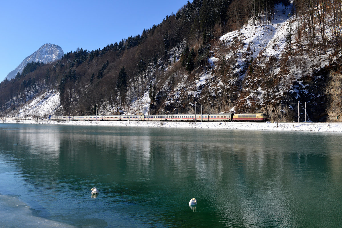 Mein lieber Schwan - auch in 2017 kommt die 103 245 noch zum Einsatz! Allen Gerüchten zum Trotz, die von Abstellung, Verkauf oder Abgabe an ein Museum sprachen. Am 22. Januar 2017 konnte die formschöne Schnellzuglok aus den 1970er Jahren vor dem IC 1284 "Großglockner" nach Flensburg beobachtet werden, den sie zwischen Wörgl und München HBF bespannte. Wenige Meter vor der Landesgrenze an der Trennstelle zwischen Kufstein und Kiefersfelden gelang diese Aufnahme. Eine Spiegelung im Wasser war leider nicht möglich, dafür stellten sich zwei Schwäne zum Zeitpunkt der Durchfahrt ein. Diese widmeten sich allerdings lieber der Gefiederpflege als der Huldigung des "Edel-Hirsches" vom BW München 1. Links im Bild: Der Pendling, Kufsteins Hausberg.
