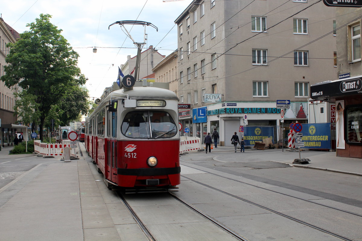 Wien Wiener Linien SL 6 (E1 4512 + c3 1261) X, Favoriten, Quellenstraße am Morgen des 12. Mai 2017. - Auf dem Zielschild des Triebwagens stand noch "Burggasse / Stadthalle ...", aber unterwegs wurde - wegen großer Verspätungen - das Ziel geändert, und der Zug wurde zum ÖBB-Bahnhof Meidling umgeleitet.