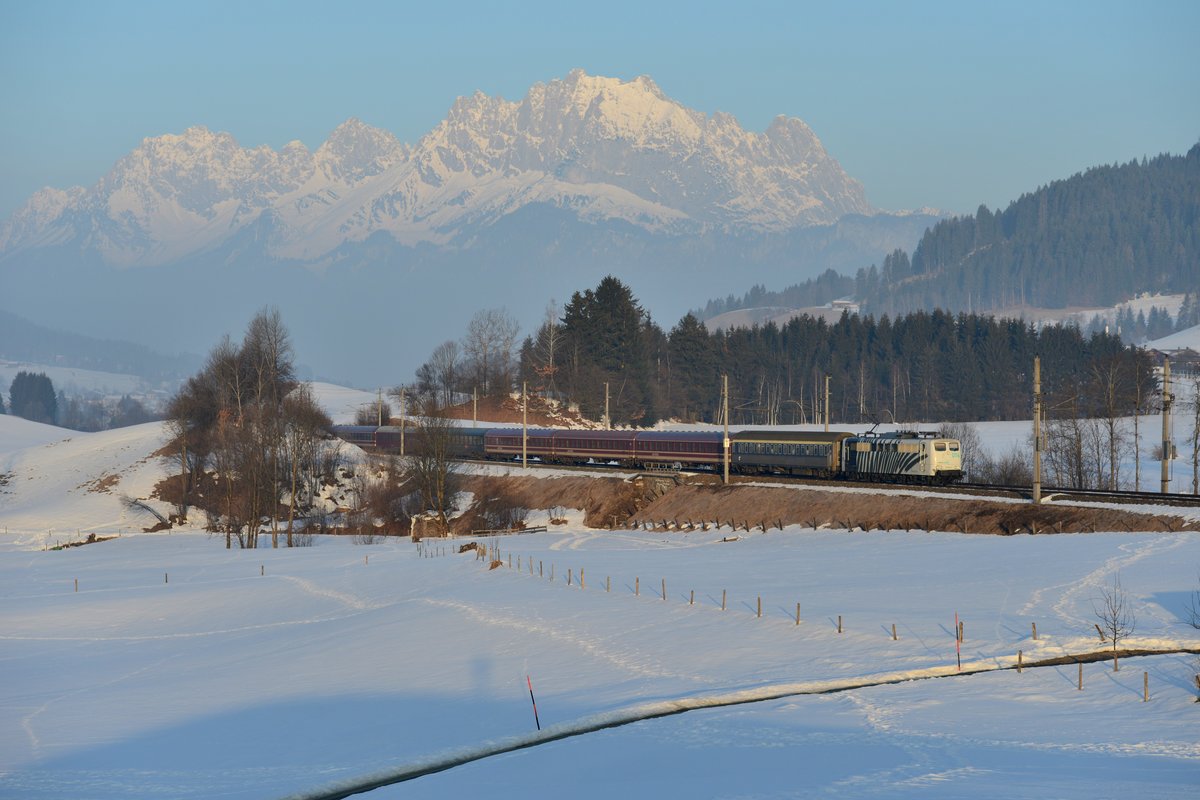 Auch dieses Jahr fahren noch Schizüge, allerdings um einiges früher als bisher. Am 11. Februar 2017 war die Sonne erst seit wenigen Minuten aufgegangen, als 151 074 mit ihrem Alpen Express D 13187 nach Schladming Fieberbrunn passierte. Seitenausleuchtung ist zu dieser Zeit noch kaum gegeben, der Wilder Kaiser hüllte sich auch noch in Dunst. Aber nachdem man nie weiß, ob ein solches Foto wiederholbar ist, zeige ich es dennoch.