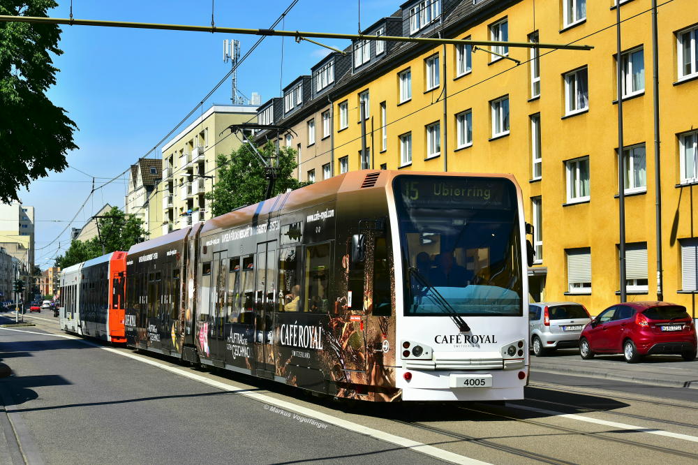 4005 wurde eine neue Ganzreklame "Café Royal" angebracht. Hier zu sehen auf der Kreuzung Wilhelm-Sollmann-Str./Neusser Straße am 29.05.2017.