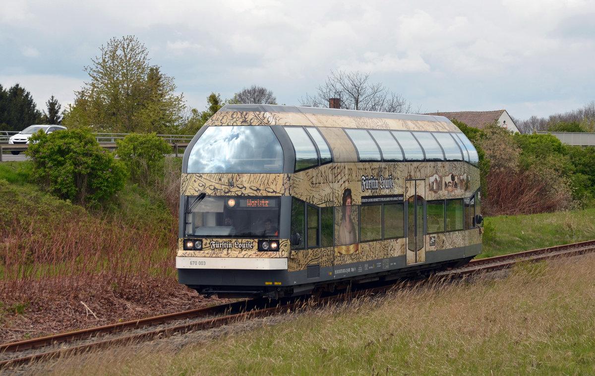 670 003 hat am 23.04.17 bereits den Bahnhof Oranienbaum verlassen und setzt nun seine Fahrt nach Dessau fort.