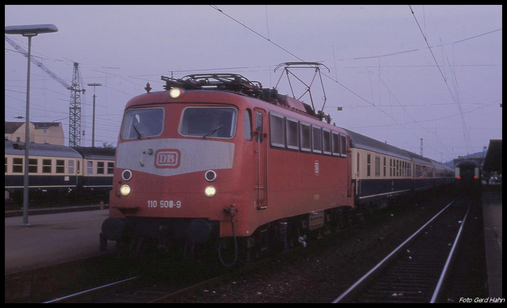 110508 mit einem blau - beigen D-Zug aus Amsterdam war am 26.8.1990 hier in Minden um 20.19 Uhr auf dem Weg nach Hannover.