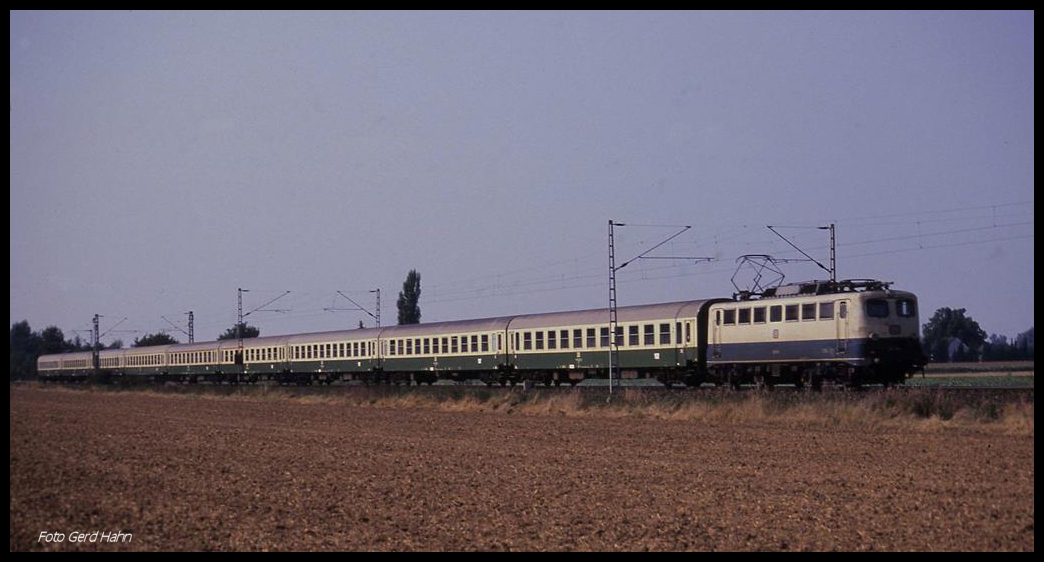Am 27.8.1990 war 110116 um 15.58 Uhr mit einer kompletten Reichsbahn Garnitur des D nach Leipzig kurz vor Paderborn unterwegs.