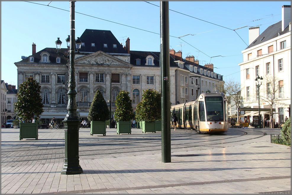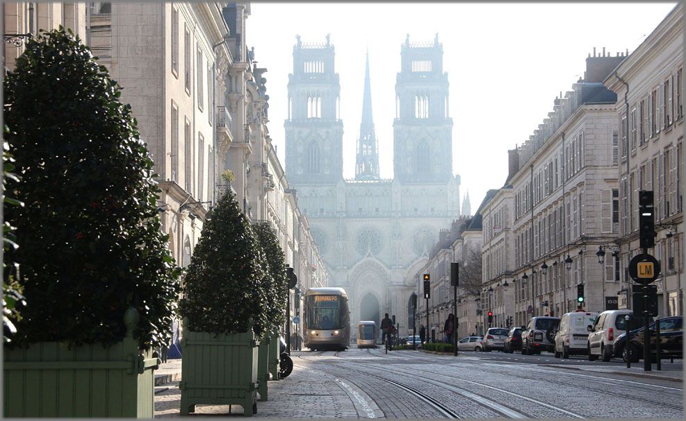 Straßenbahnbetrieb im Gegenlicht in der Rue Jeanne d'Arc, im Hintergrund die Kathedrale. 3.4.17.