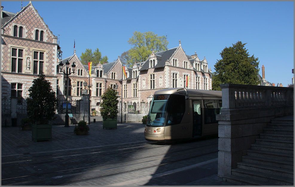 Ein Wagen der Linie 2 am Place Sainte-Croix - zu beachten ist dieser oberleitungsfreie Abschnitt der Tram. 3.4. 17