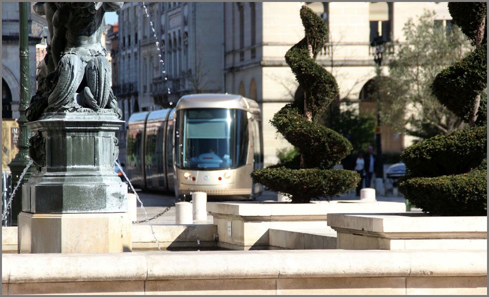 Ein Wagen der Linie 2 auf dem Place de l'Etape - zu beachten ist dieser oberleitungsfreie Abschnitt der Tram. 3.4.17.