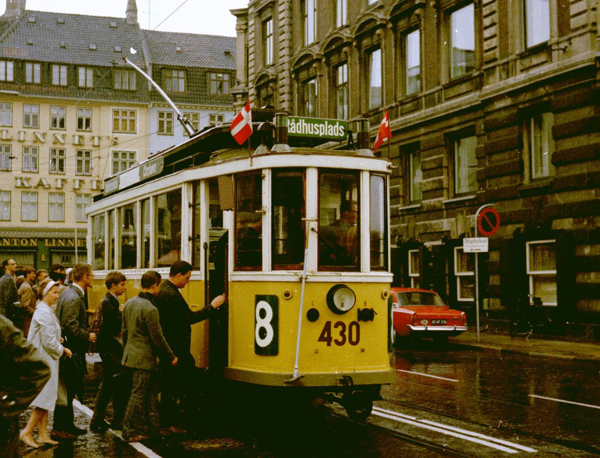 København / Kopenhagen Københavns Sporveje (KS): Am Wochenende dem 17. und dem 18. August 1968 konnte der Stadtteil Christianshavn sein 350jähriges Jubiläum feiern. Anlässlich des Jubiläums war ein Teil der (1965 eingestellten) SL 8 wiedererstanden. Auf dieser "Jubiläumslinie" waren am Samstag dem 17. die beiden KS-Museumstriebwagen 305 und 430 in Betrieb und zwar zwischen Rådhusplads (Studiestræde) und Christianshavn (Skånegade auf der Insel Amager wegen einer fehlenden Wendeschleife im Stadtteil Christianshavn). - Auf dem Bild hält der Tw 430 am 17. August in der Studiestræde. - Der Tw befindet sich heute in der Sammlung des Dänischen Straßenbahnmuseums (Sporvejsmuseet Skjoldenæshom). - Scan von einem Farbnegativ. Film: Kodak Kodacolor X Film.