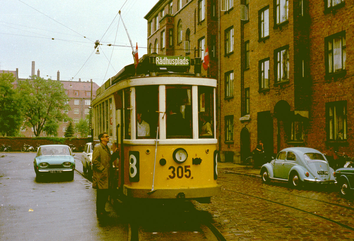 København / Kopenhagen SL 8 (KS-Museumstriebwagen 305) København Vesterbro, Studiestræde (Endst. Rådhusplads) am 17. August 1968. - Anlässlich des 350jährigen Jubiläums des Stadtteiles Christianshavn war die SL 8 für zwei Tage wiedererstanden. Auf der Linie fuhren am Samstag dem 17. August zwei KS-Museumstriebwagen, 305 aus der Serie 305-314 (1911 von der Waggonfabrik Scandia gebaut) und 430 aus der Serie 422-446 (1915-1920 von der Waggonfabrik Scandia gebaut). - Der Tw 305 befindet sich heute in der Sammlung des Dänischen Straßenbahnmuseums (Sporvejsmuseet Skjoldenæsholm). - Scan von einem Farbnegativ. Film: Kodak Kodacolor X Film.