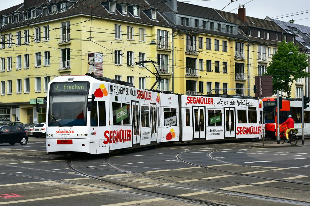 4546 wurde als 35. Fahrzeug eine neue Ganzreklame für das Möbelhaus "Segmüller" angebracht. Hier zu sehen auf der Kreuzung Aachener Str./Gürtel am 07.05.2017.