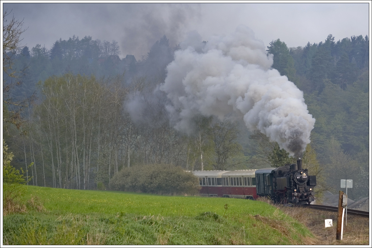 Ein Zug gewaltiger Länge unterwegs zum Oldtimertreffen nach Ernstbrunn. Entstanden ist die Aufnahme im zweiten Gleisbogen bei Hetzmannsdorf. Zuglok ist die 93.1420, die direkt hinter der Dampflok gereihte Diesellok ist kaum zu sehen. (07.05.2017)